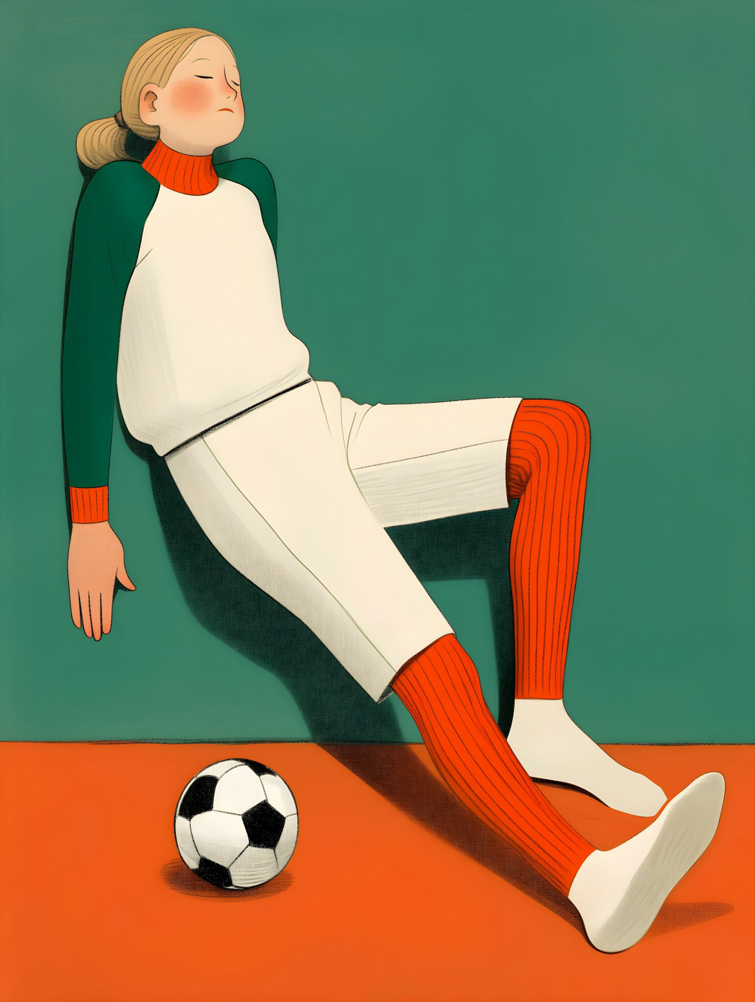 Stylized illustration of a person in sportswear resting against a wall with a soccer ball nearby, featuring bold colors and clean lines.