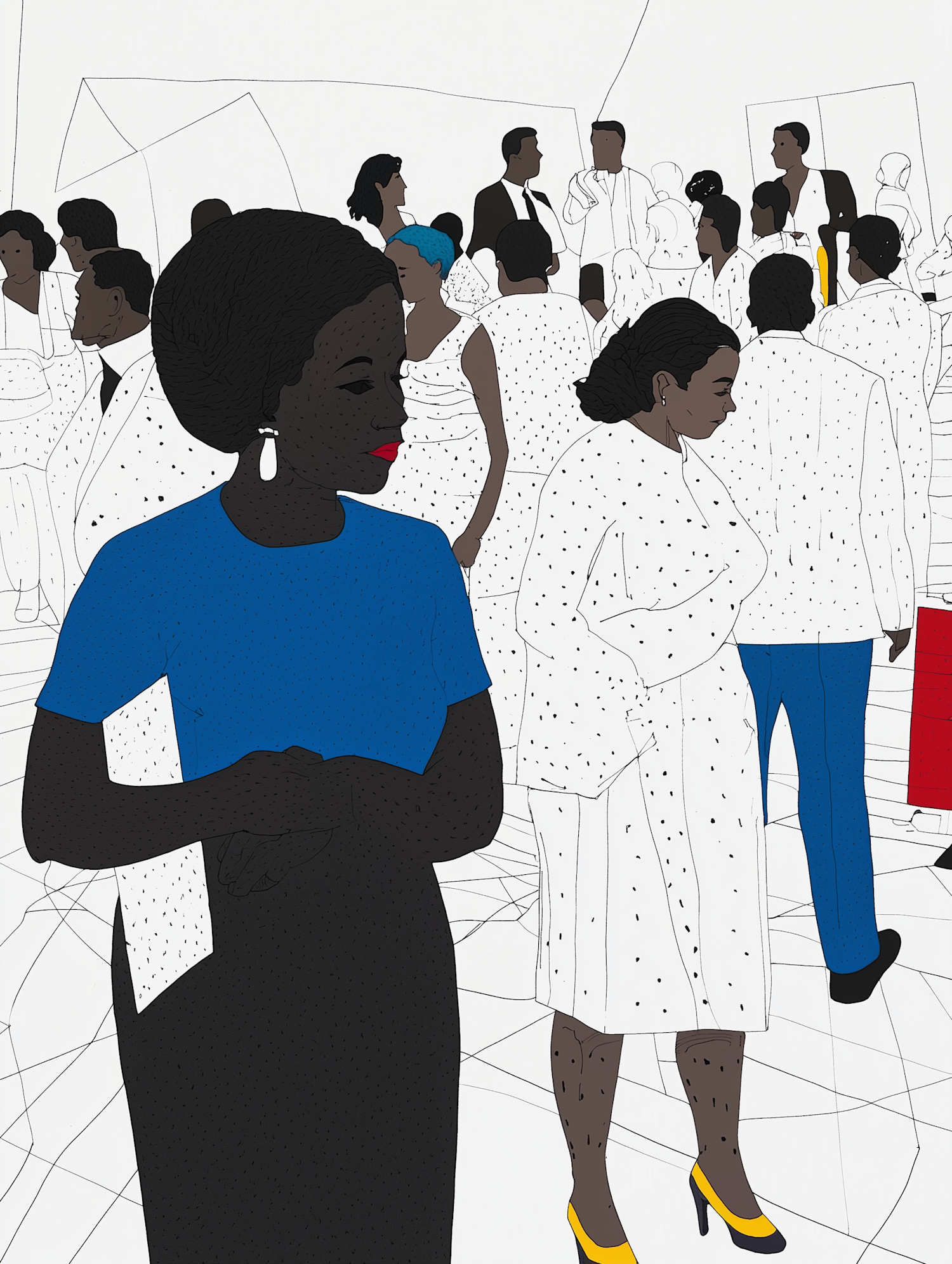 Stylized illustration of a formal gathering with diverse individuals in elegant attire, featuring bold colors and minimalist details.