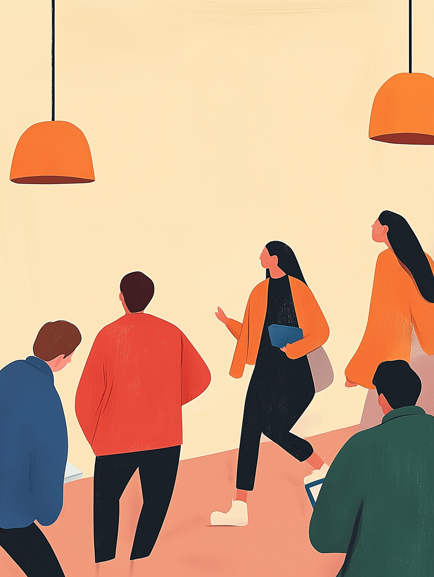 Stylized illustration of five people walking indoors under orange pendant lights, dressed in casual attire, conveying movement and interaction.