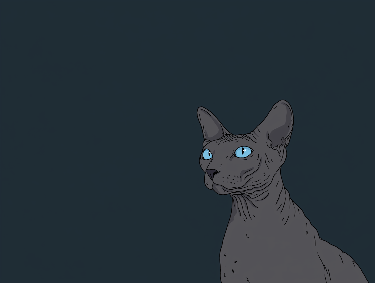 Illustration of a grey Sphynx cat with blue eyes on a minimalist dark teal background, emphasizing the sleek and unique look.