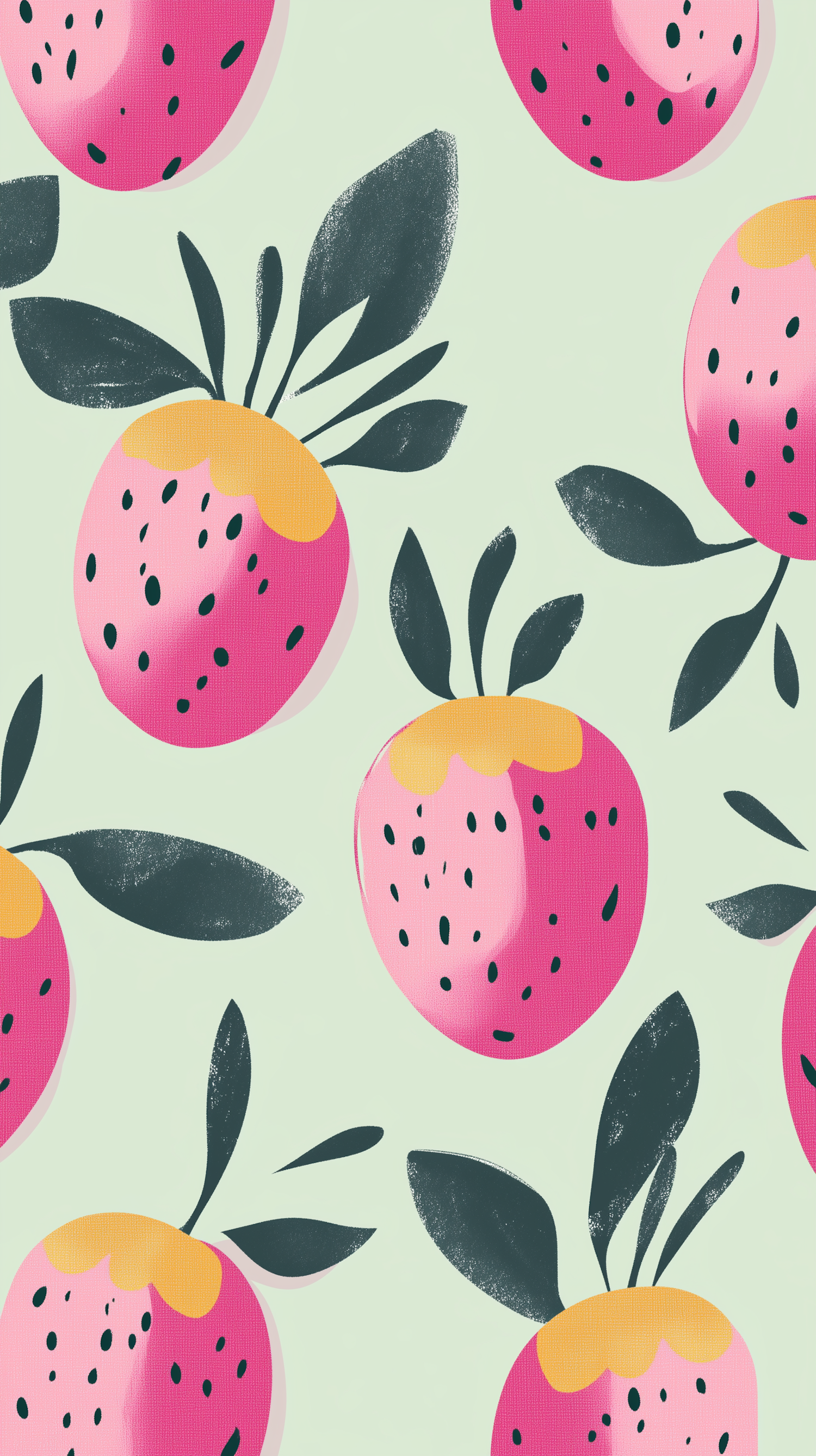 Vibrant illustration of stylized pink strawberries with yellow tops and green leaves on a light green background.