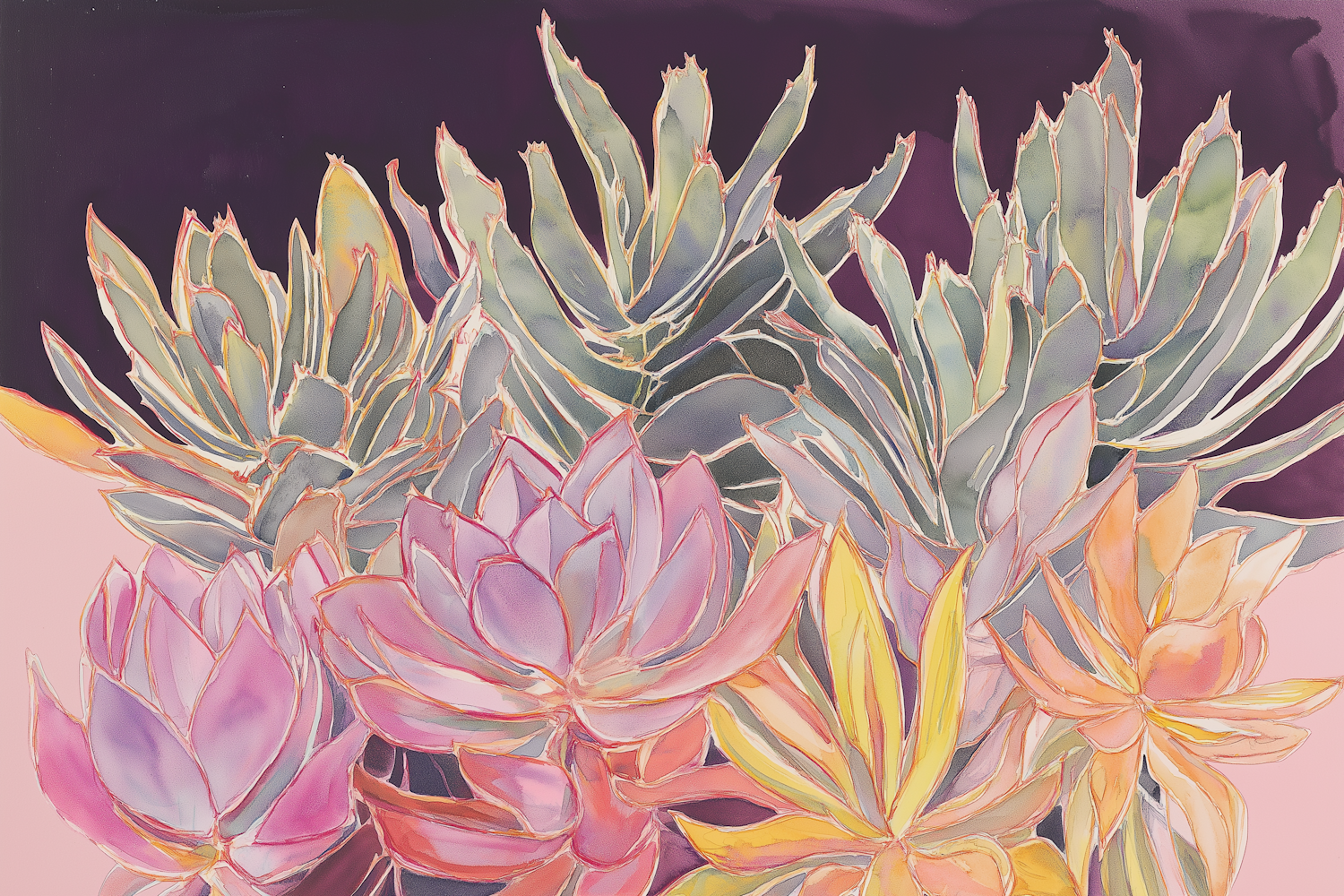 Colorful illustration of succulents with pink, purple, and green hues against a dark background, highlighting their vibrant beauty.