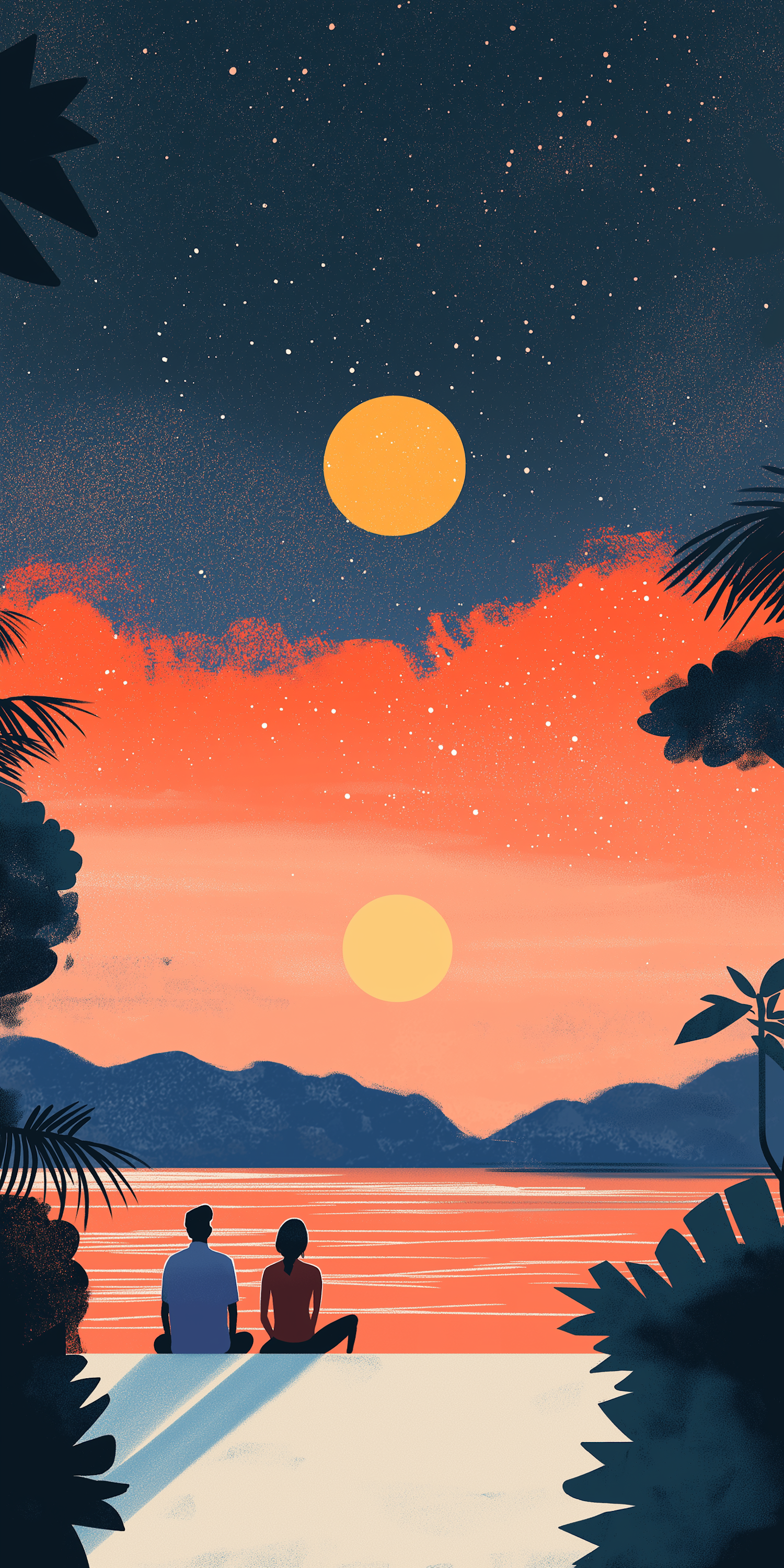 Illustration of a couple watching a dual sunset on a beach, surrounded by tropical foliage and a vibrant sky.