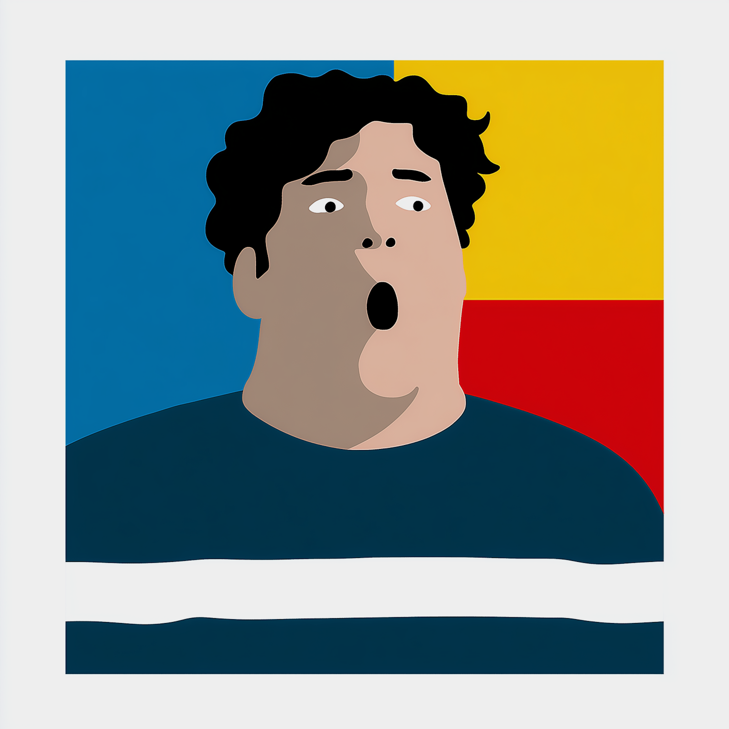 Minimalist illustration of a surprised person with bold colors and geometric shapes, featuring a vibrant blue, yellow, and red background.