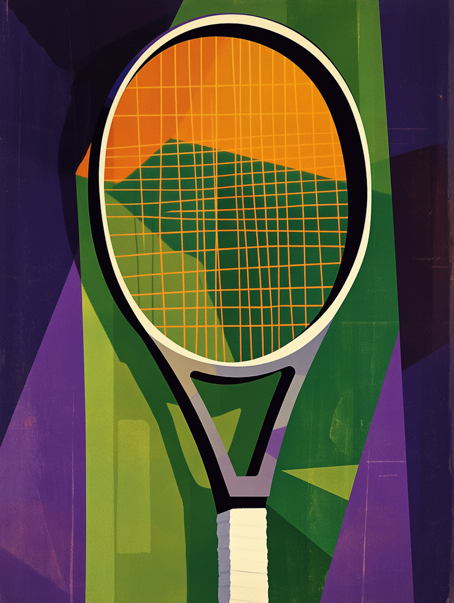 Abstract illustration of a tennis racket with vibrant green, purple, and orange geometric shapes.