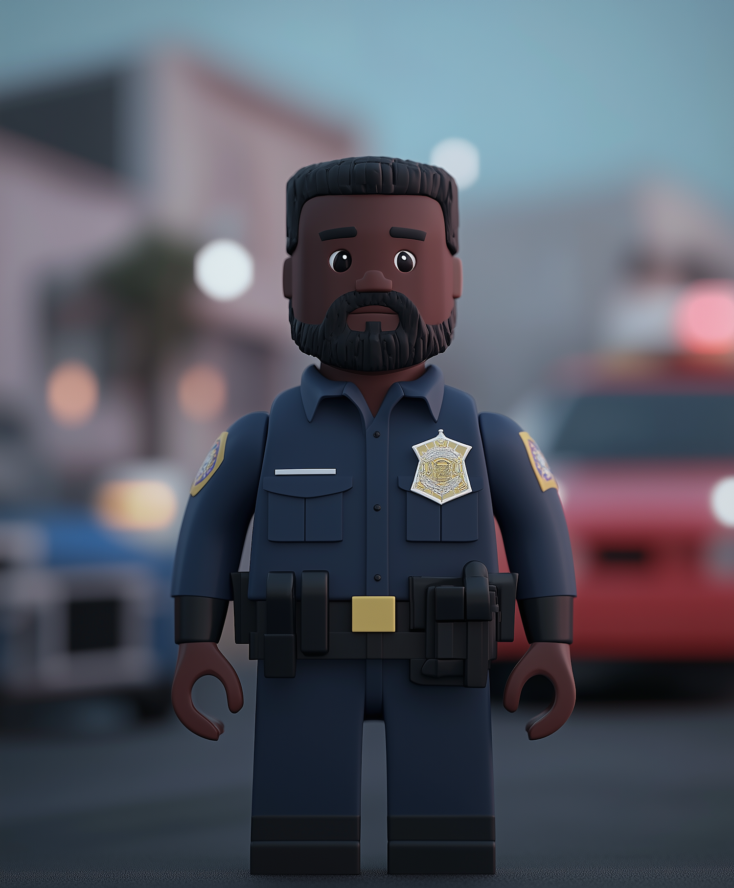 3D-rendered toy police officer with dark skin, navy uniform, and badge, set against a blurred city street background.