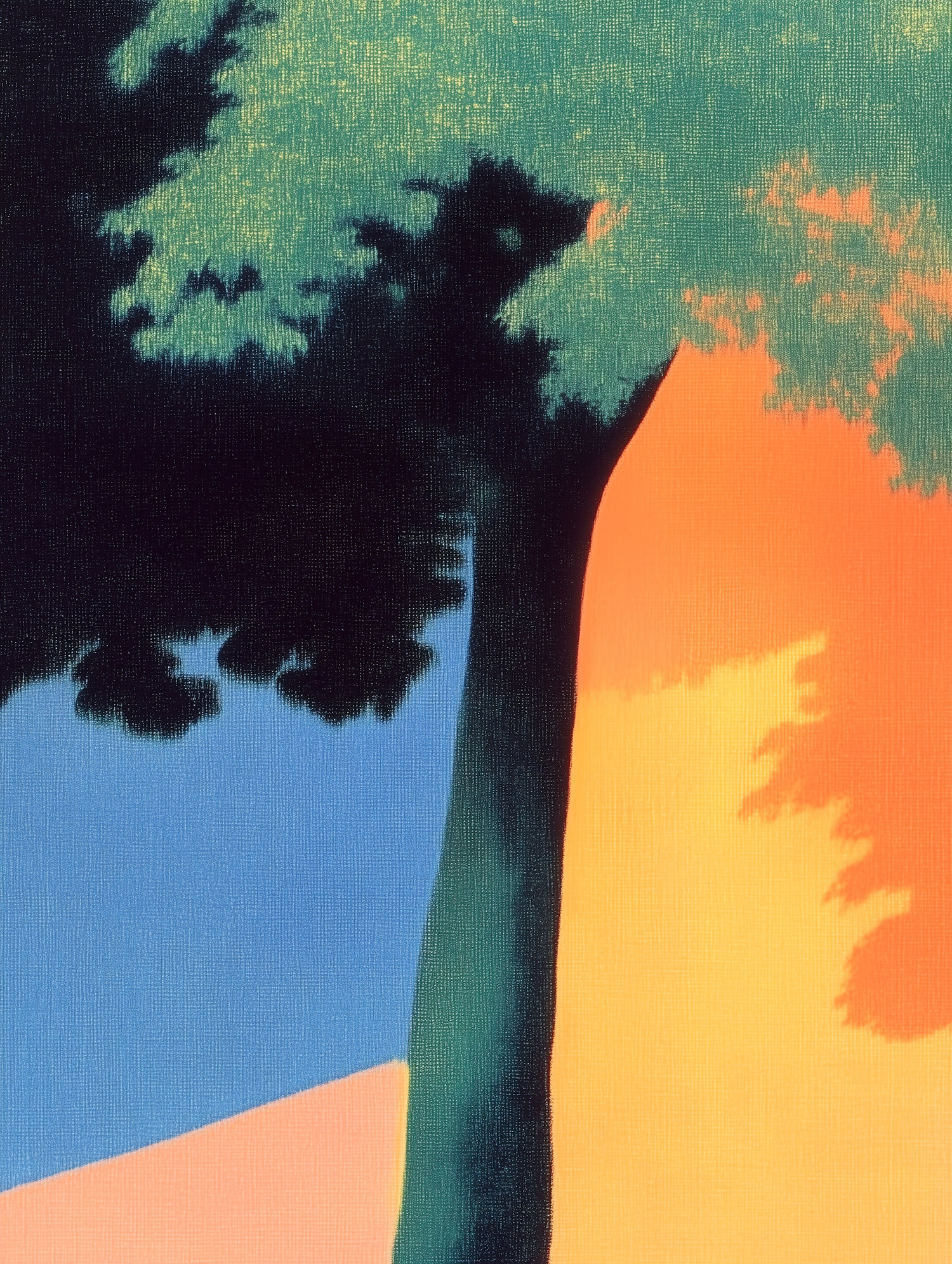 Stylized tree illustration with bold green foliage, a deep green trunk, and a vibrant blue-orange split background. Modern and abstract design.