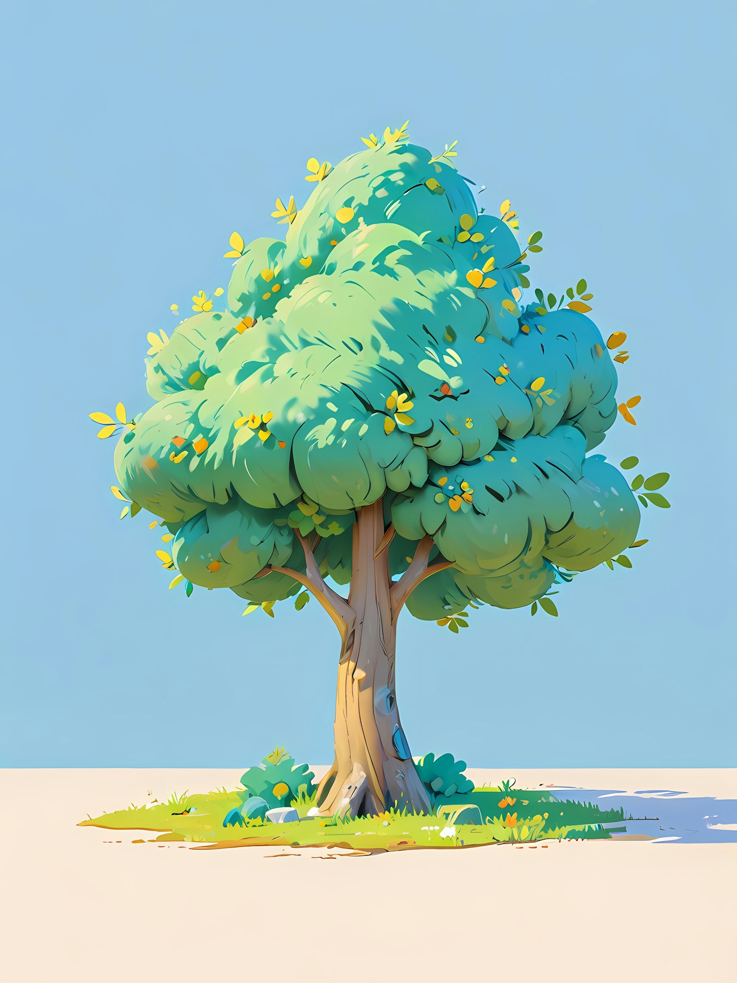 Bright cartoon-style tree with lush green and yellow leaves, textured trunk, and grassy base under a clear blue sky.