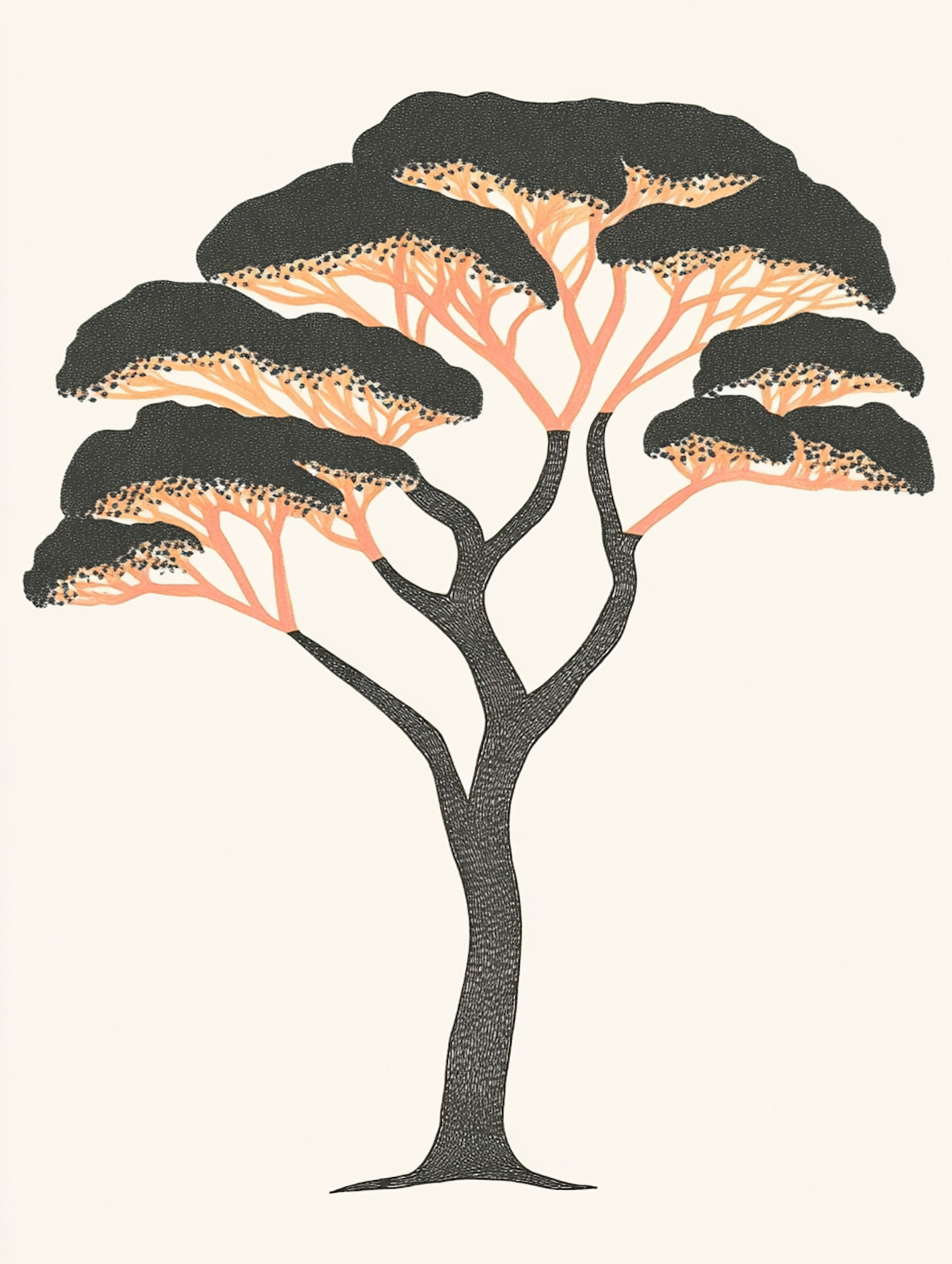 Minimalist tree illustration with textured black trunk, peach branches, and dark green umbrella-like foliage on an off-white background.