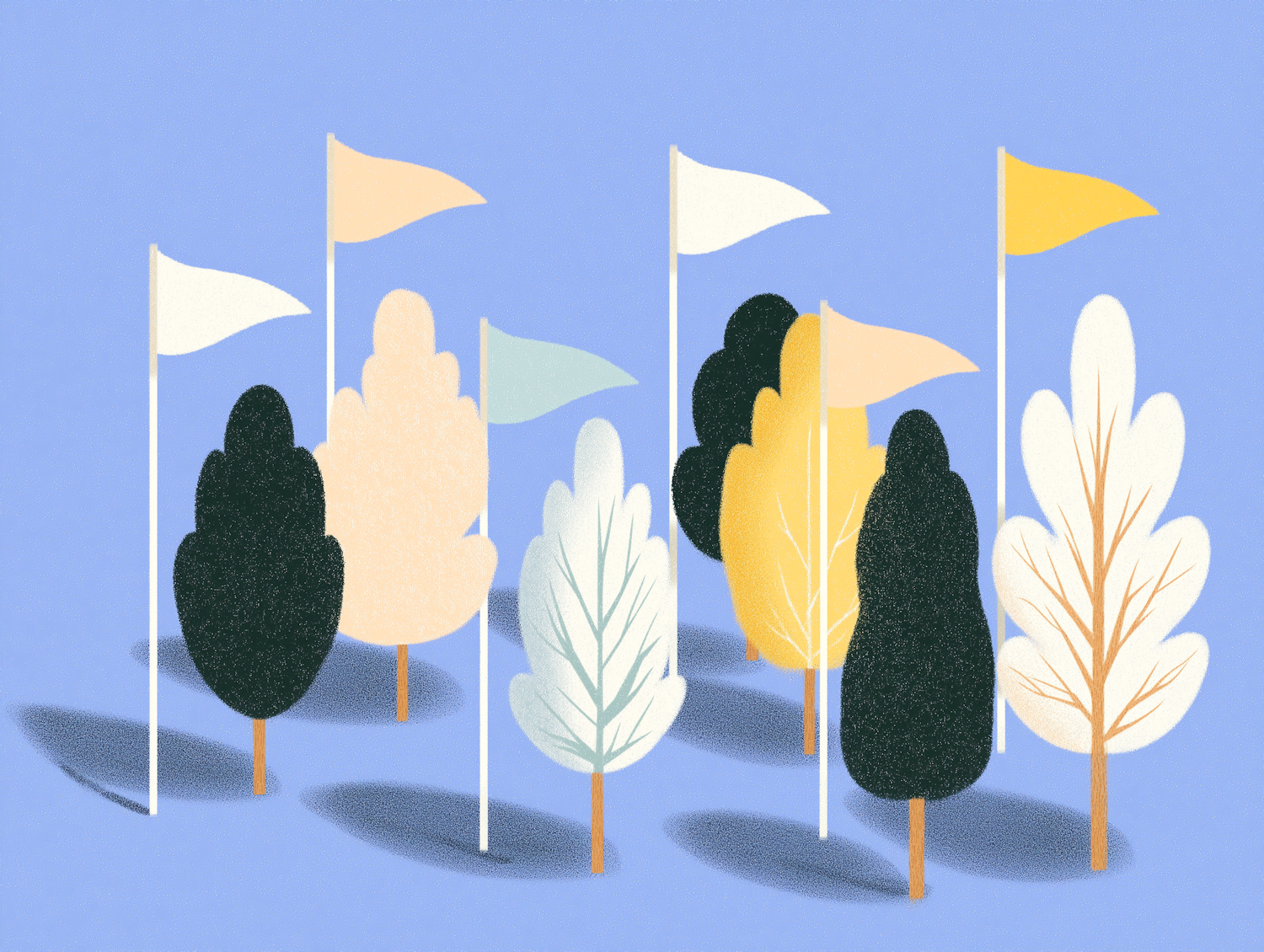 Stylized flags with trees on a light blue background, creating a serene and minimalistic illustration.