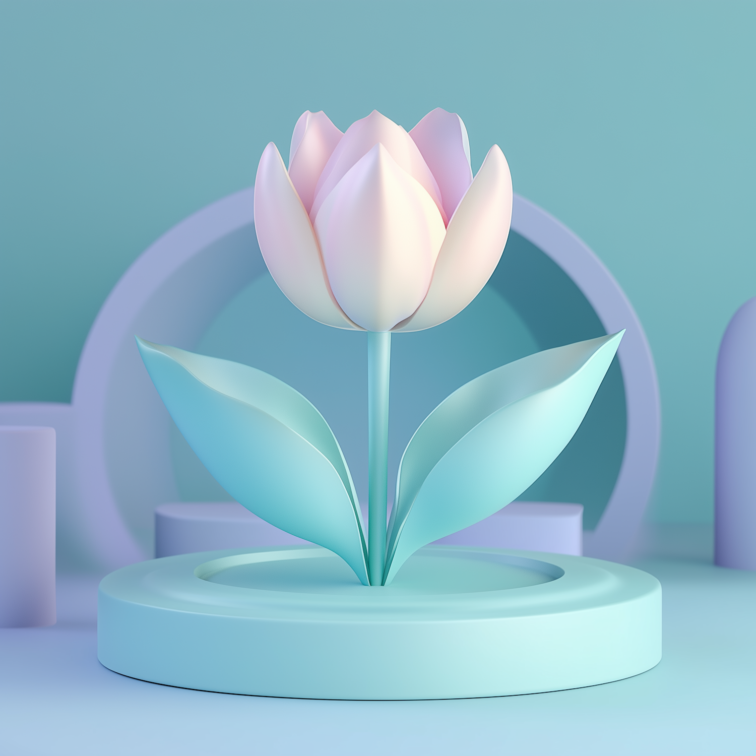 A pastel 3D tulip with pink petals and mint green leaves on a teal background, perfect for modern and minimalistic design lovers.