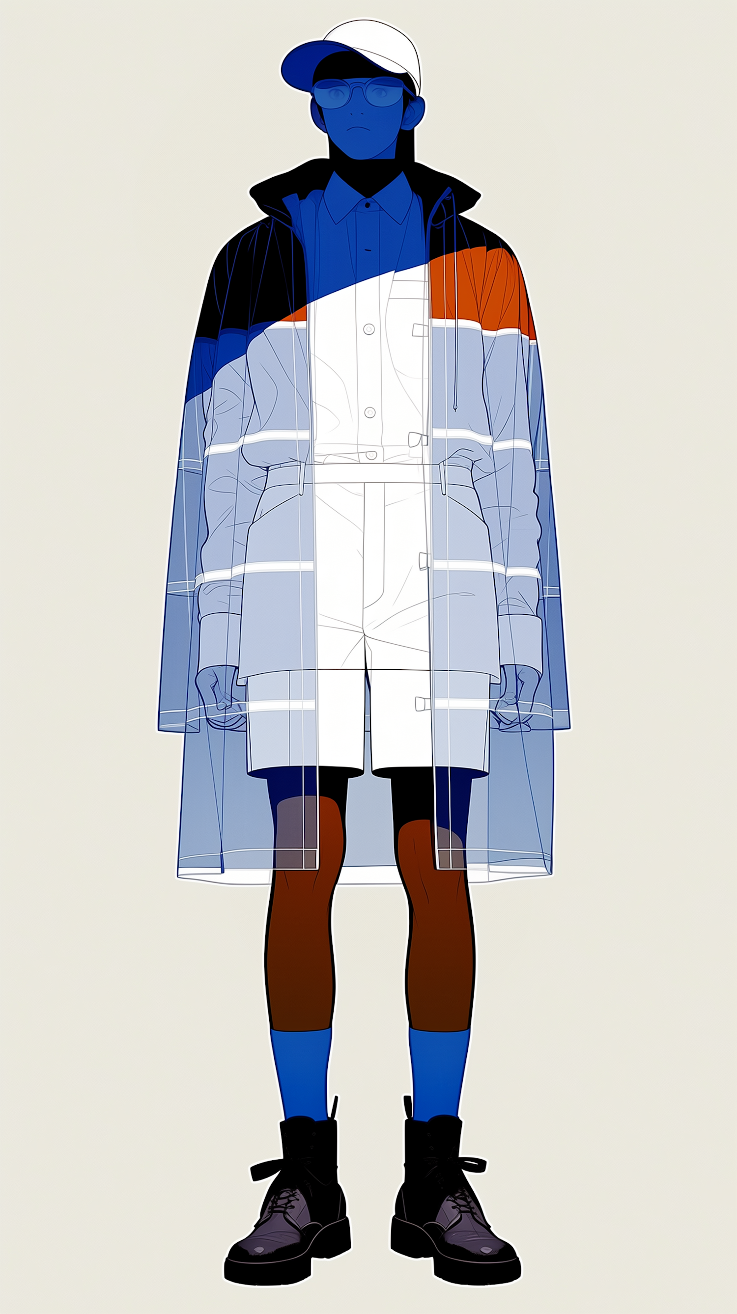 Stylized illustration of a person in a transparent raincoat, color-blocked outfit, and black boots, showcasing modern urban fashion.