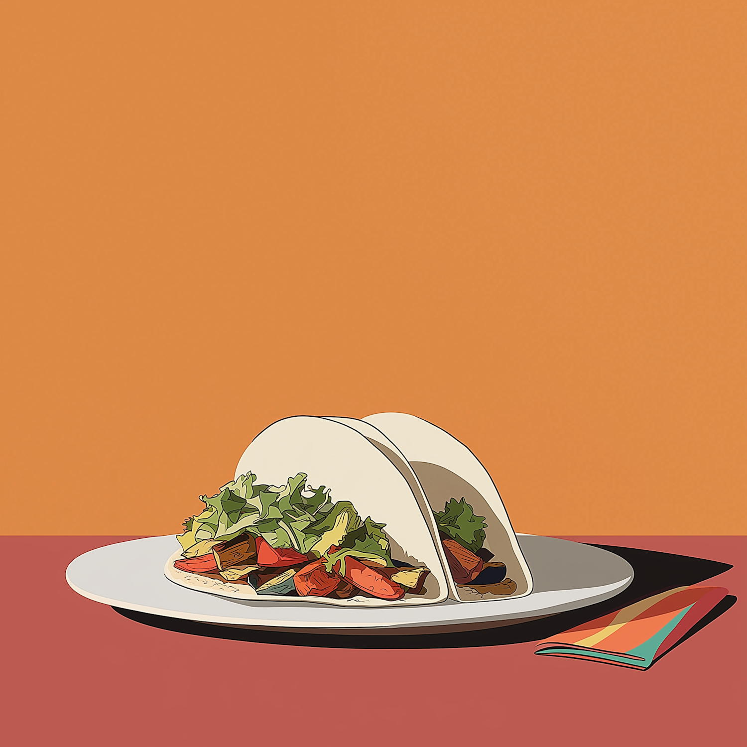 Illustration of two soft tacos with fresh veggies on a plate, set against a warm orange background with a colorful napkin.