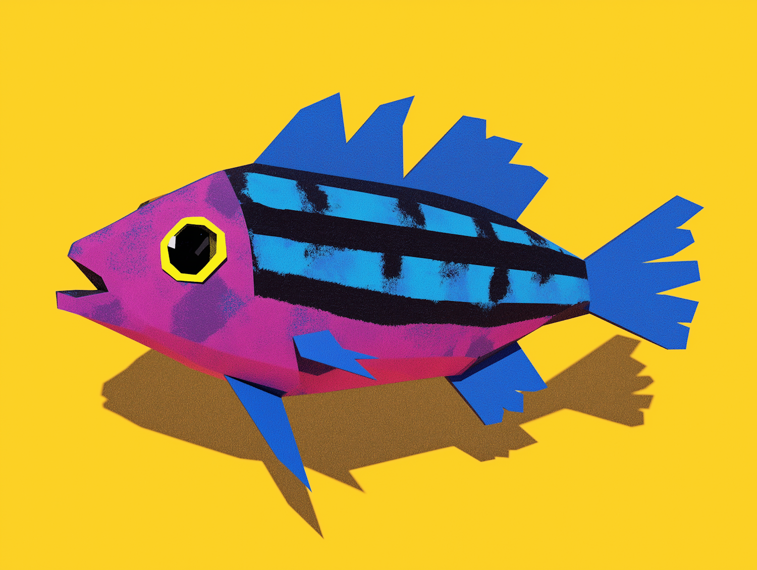 Colorful fish illustration with pink body, blue fins, and black stripes on a bright yellow background. Geometric and vibrant design.