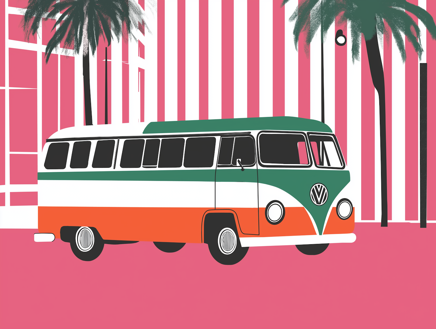 Retro Volkswagen van in green, white, and orange against a pink striped background with palm trees, evoking a tropical, vintage vibe.