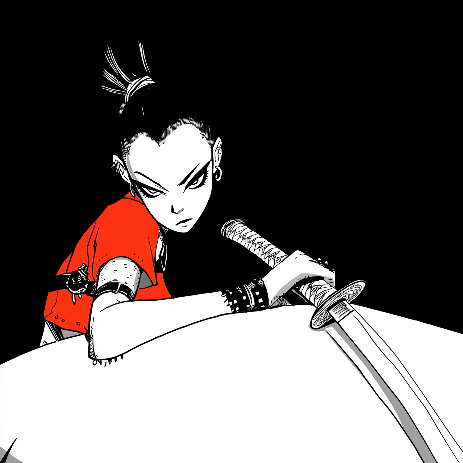 Dynamic anime-style illustration of a fierce character in a red shirt holding a katana, set against a stark black background.