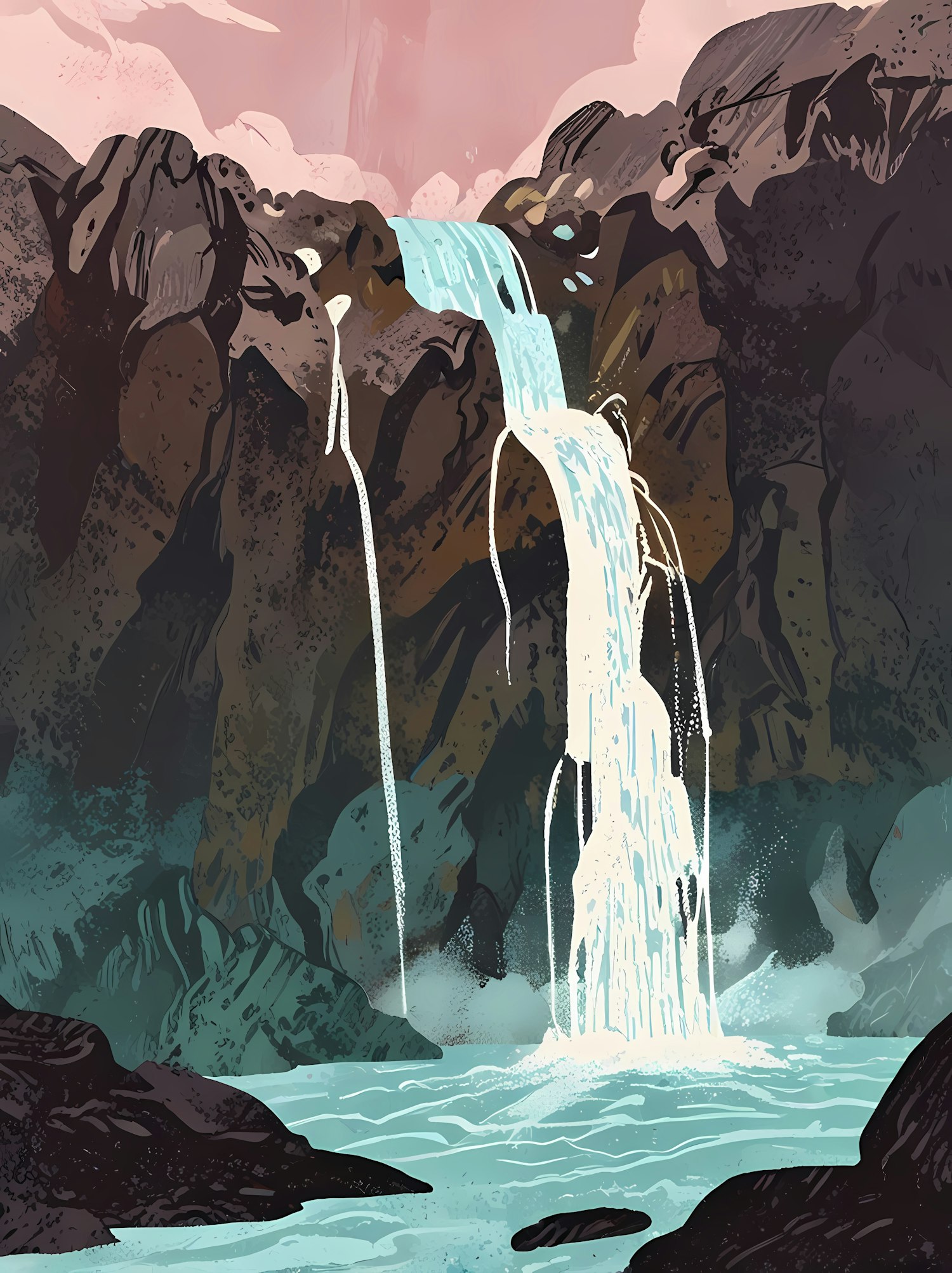 Beautiful stylized illustration of a waterfall cascading over dark rocks into a tranquil pool, set against a soft pink sky.