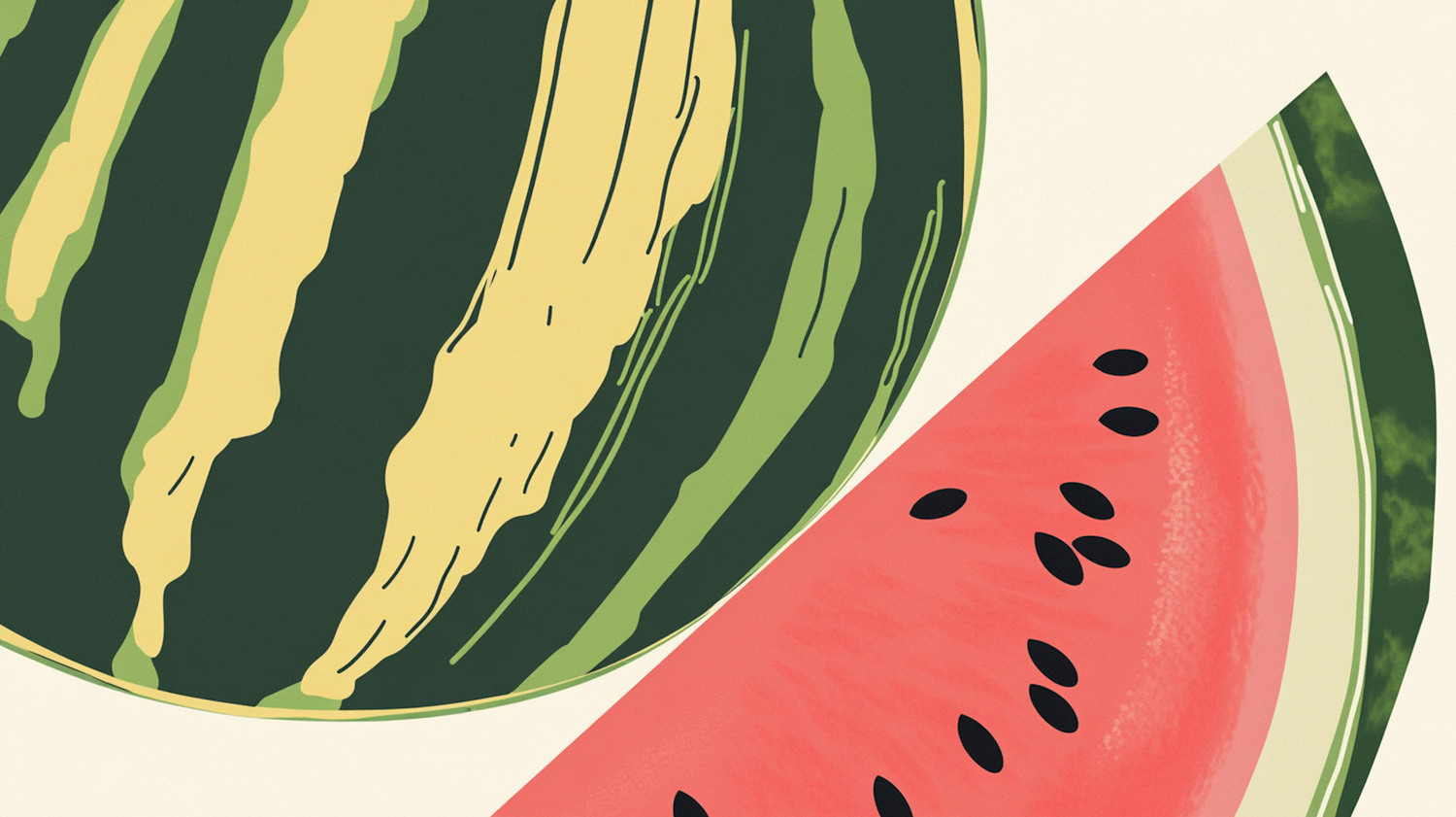 Vibrant illustration of a watermelon with a striped rind and juicy pink slice, highlighting its natural beauty and bold colors.