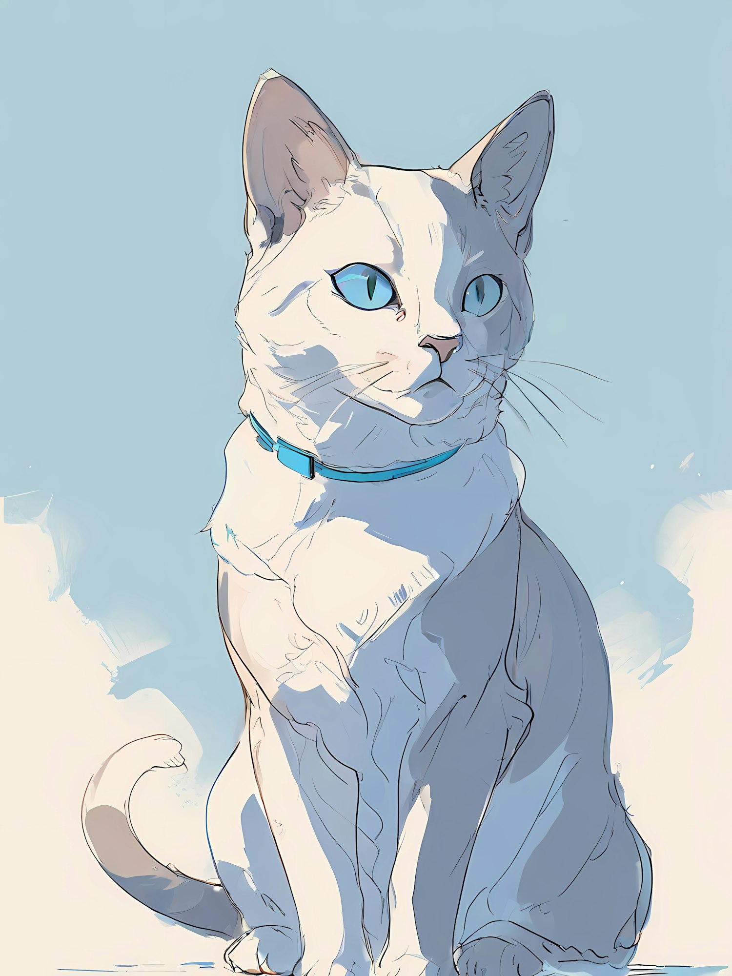 Stylized illustration of a white cat with blue eyes and a matching collar, sitting gracefully against a soft blue background.