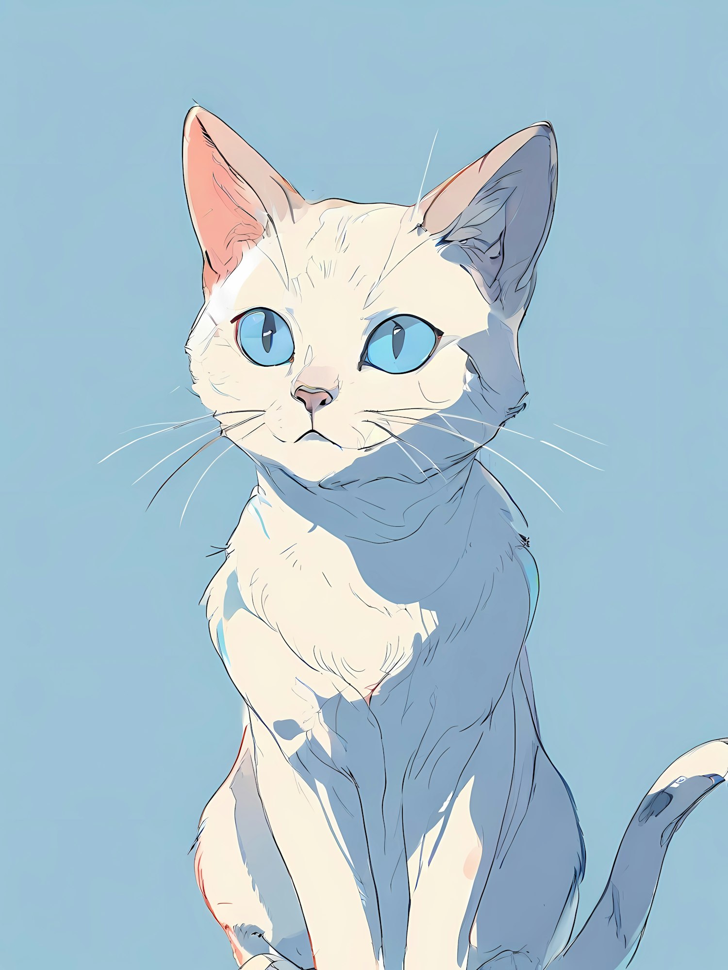 A minimalistic illustration of a white cat with blue eyes, sitting calmly against a pastel blue background. Soft and serene vibes.