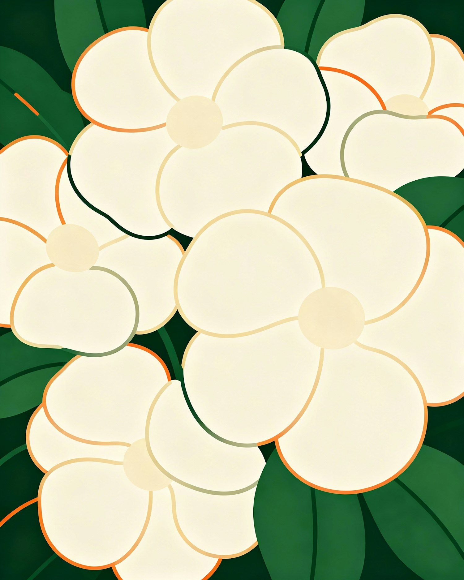 A modern illustration of white flowers with orange outlines and green leaves, creating a vibrant and minimalistic floral composition.