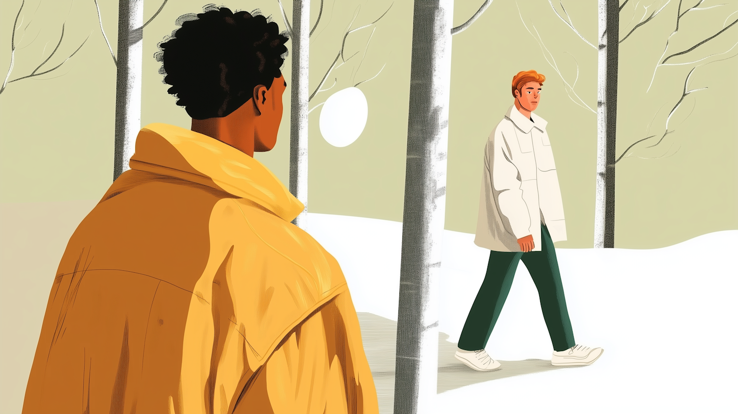 Stylized winter scene with two men in colorful coats walking through a snowy forest, surrounded by bare trees and a soft green sky.