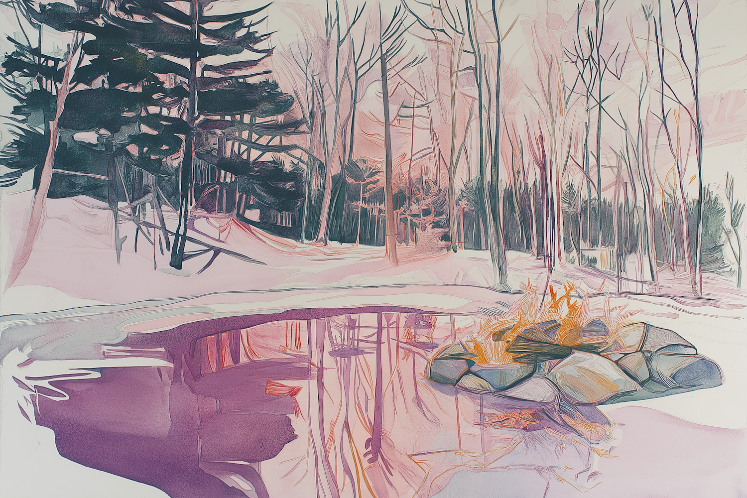 Artistic winter forest scene with a glowing campfire, snow-covered trees, and reflections on a frozen pond in soft pink and purple hues.
