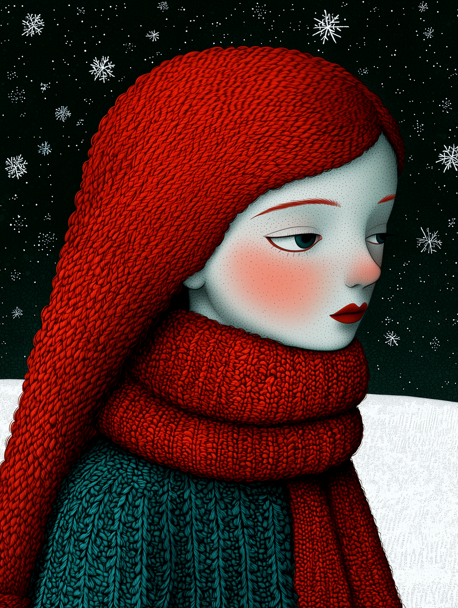 Stylized illustration of a person with red hair and scarf against a snowy night sky, featuring vibrant colors and serene expression.