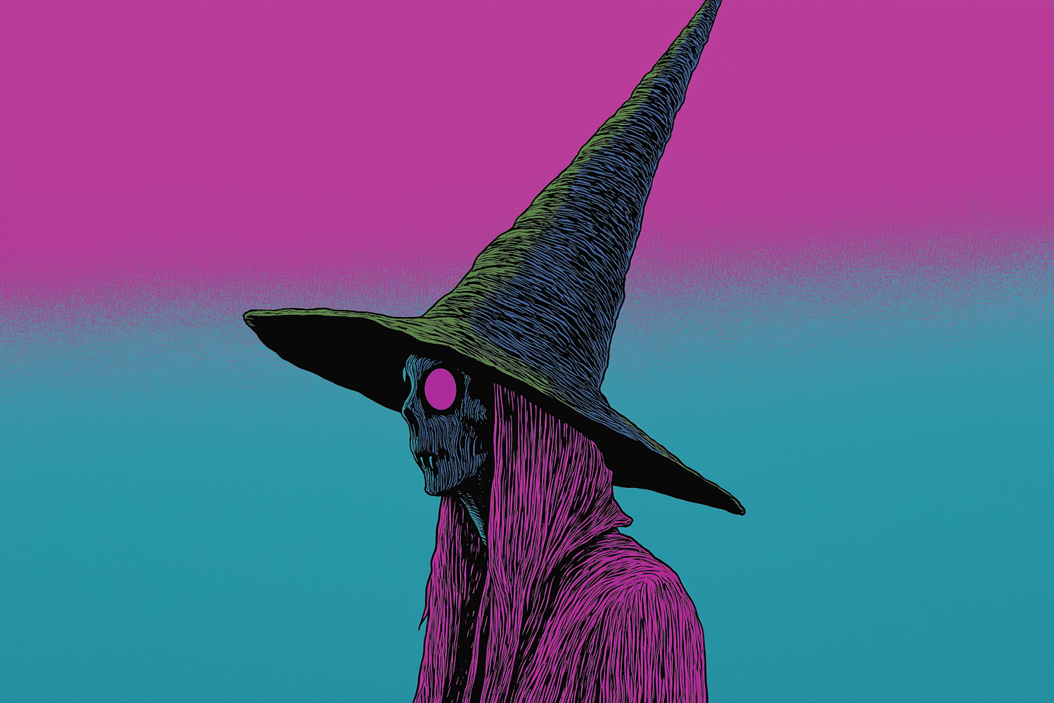 Surreal illustration of a skeletal figure in a witch's hat with a vibrant pink and teal background, blending fantasy and horror.