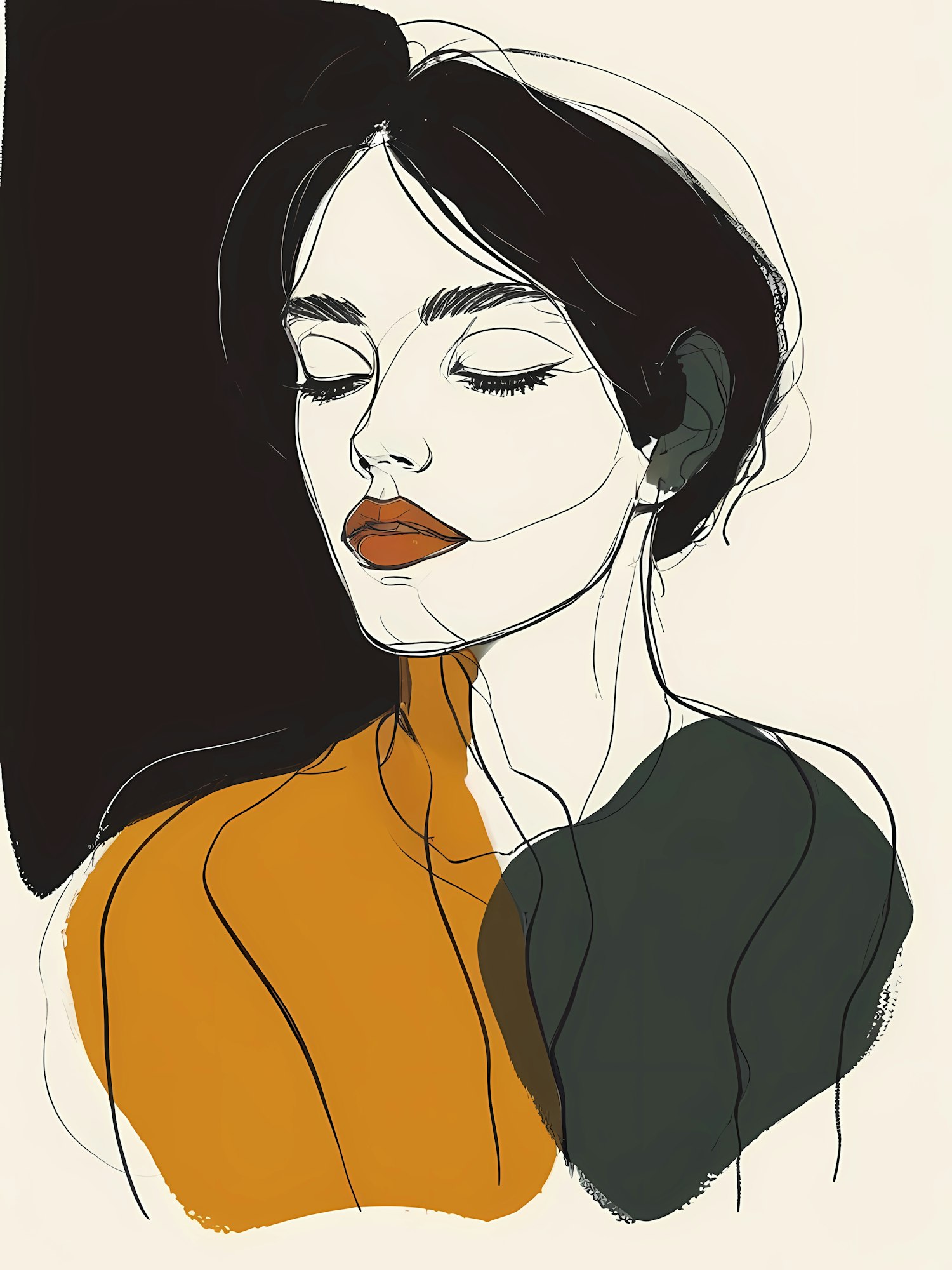 Abstract illustration of a woman with closed eyes, featuring bold colors and fluid lines, creating a serene and introspective mood.