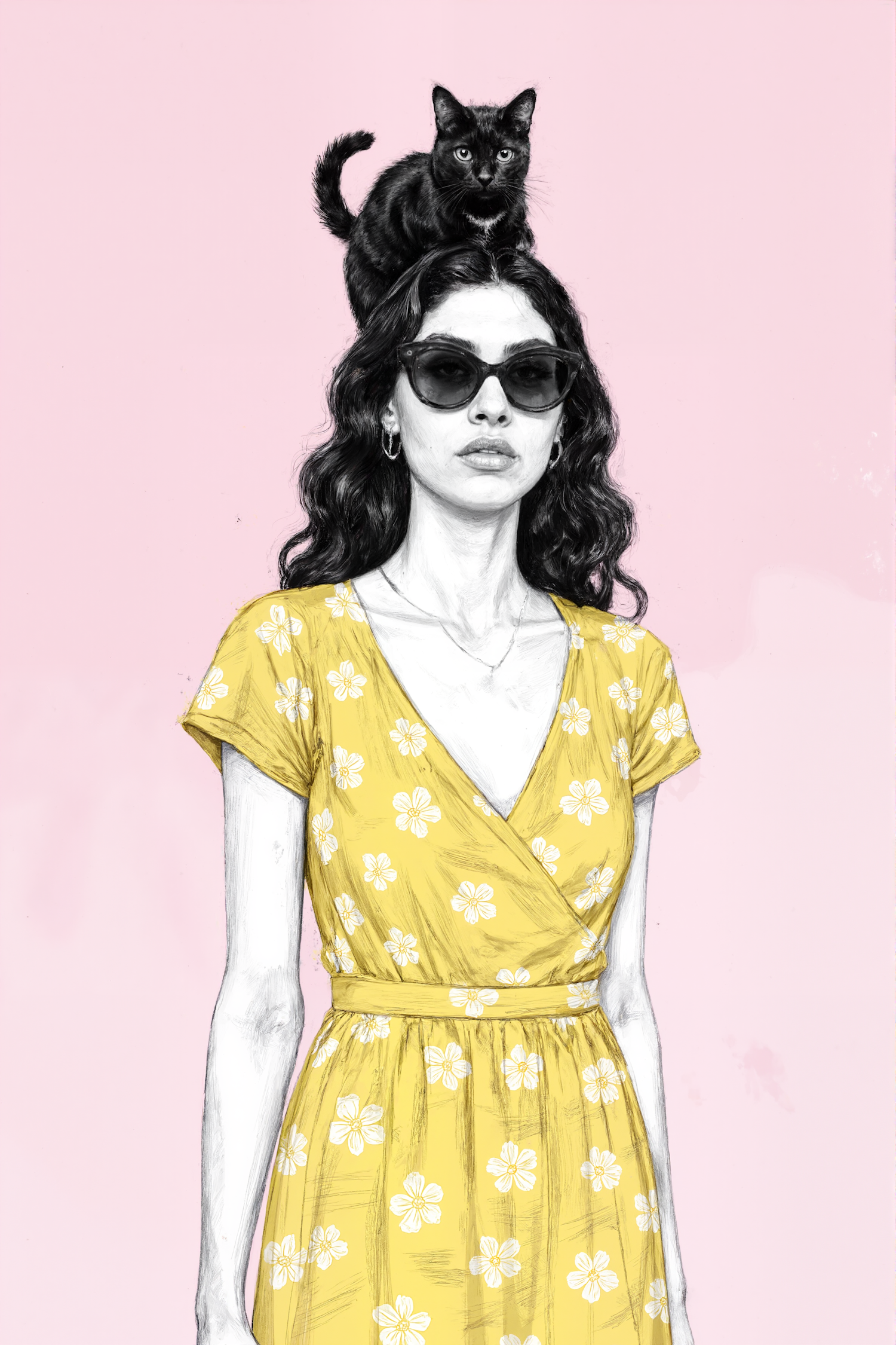 Stylized illustration of a woman in a yellow floral dress with a black cat on her head, set against a pastel pink background.