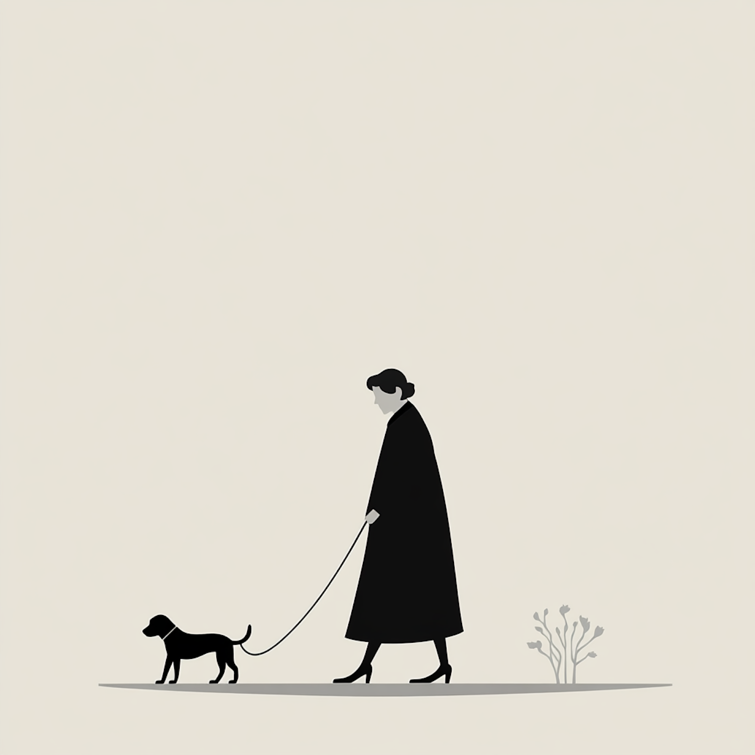 Minimalist illustration of a person walking a dog on a leash, set against a plain beige background with a small plant.