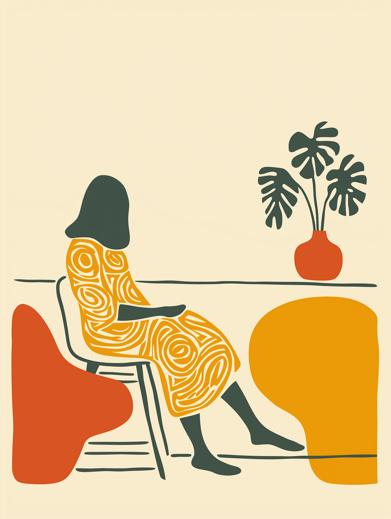Minimalist illustration of a woman in a patterned yellow dress sitting by a table with a red vase and monstera leaves, set on a beige background.