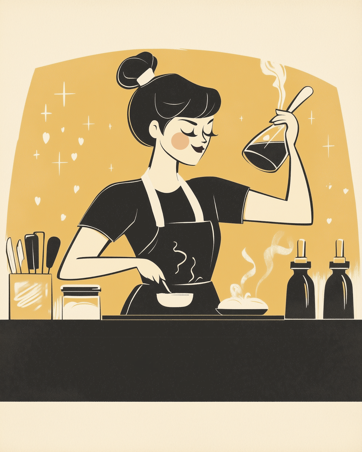 Stylized illustration of a woman cooking, holding a steaming bowl and a flask, set against a warm mustard background with sparkles.