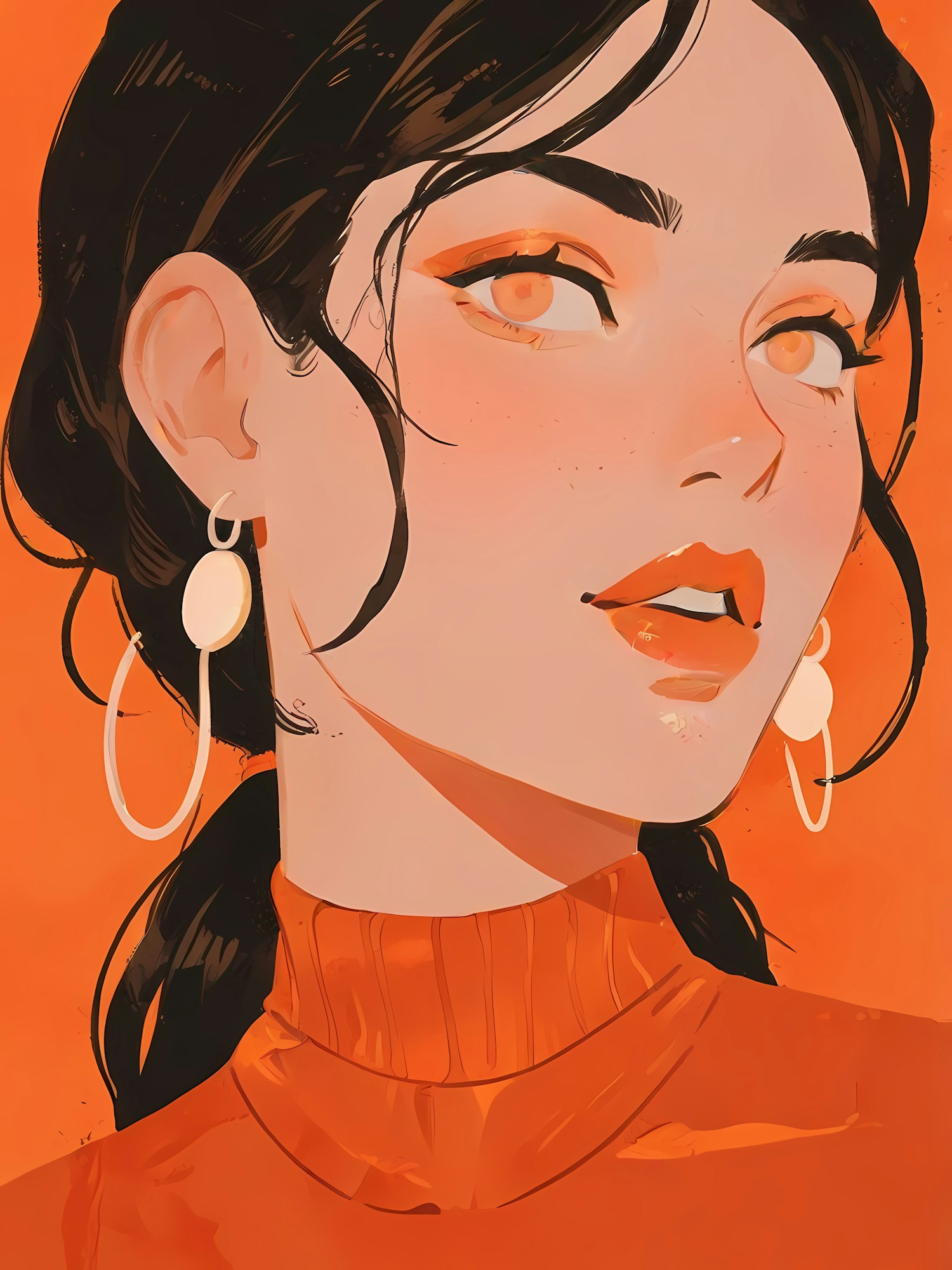 Stylized illustration of a woman with dark hair, orange eyes, and large earrings against an orange background.