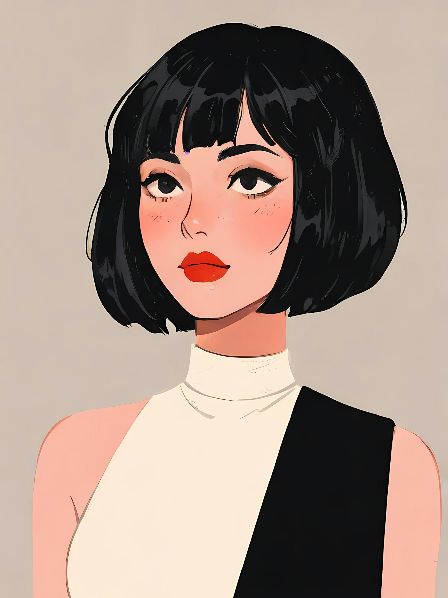Stylish digital illustration of a woman with a bob haircut, red lips, and a black and white top against a beige background.