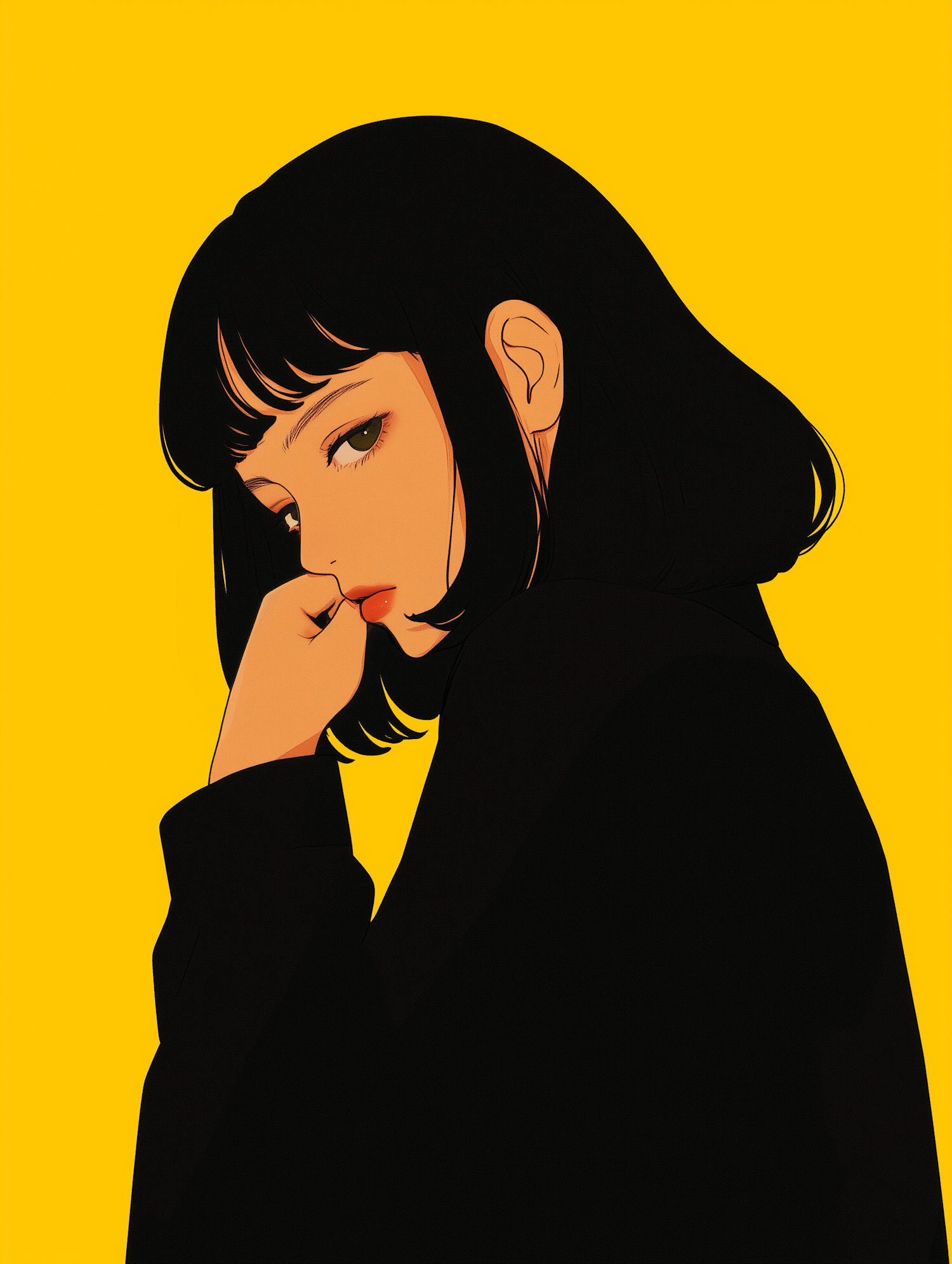 Illustration of a thoughtful woman with black hair against a vibrant yellow background, exuding a contemplative mood.