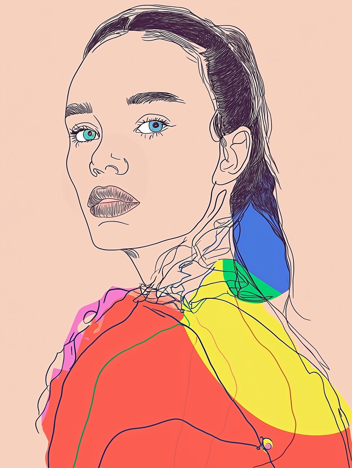 Modern illustration of a woman with bold colors and abstract shapes, featuring striking blue-green eyes and a soft beige background.