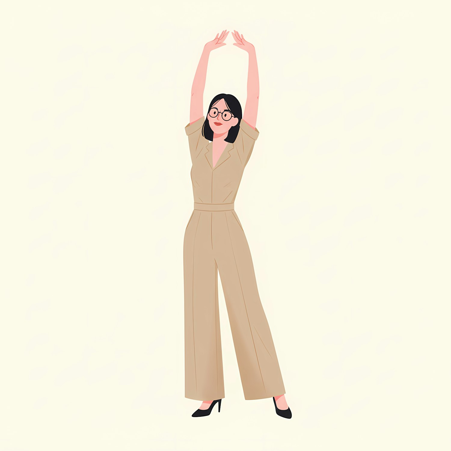 Illustration of a woman in a beige jumpsuit stretching with arms raised, set against a light cream background.