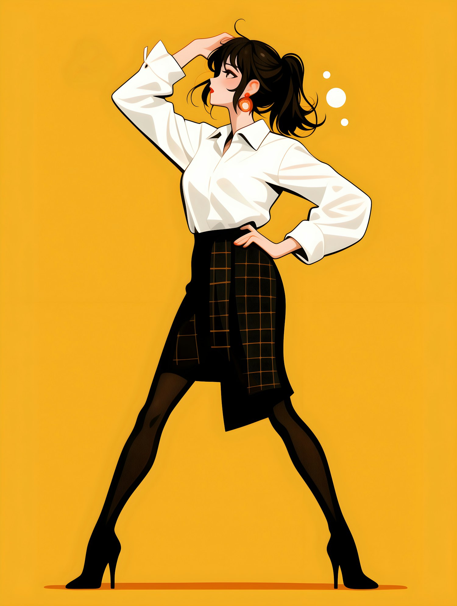 Stylish illustration of a woman in a white blouse and black skirt, striking a confident pose against a vibrant yellow background.