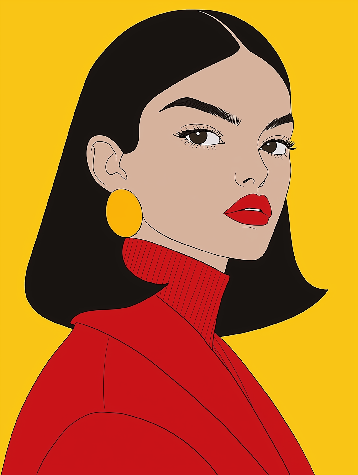 Bold illustration of a woman with red attire and yellow earrings against a vibrant yellow background, exuding confidence and style.