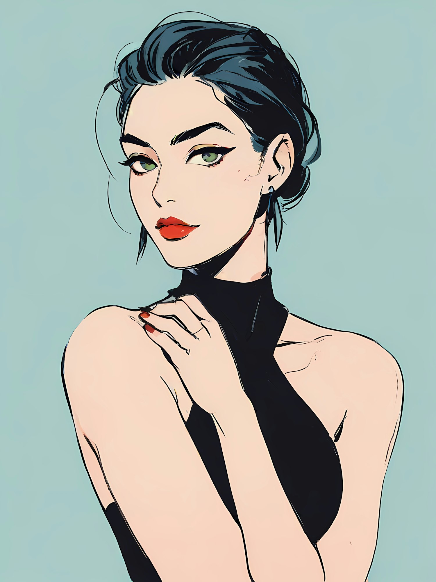 Elegant illustration of a woman with green eyes, dark hair, bold makeup, and a black high-neck top against a pastel teal background.