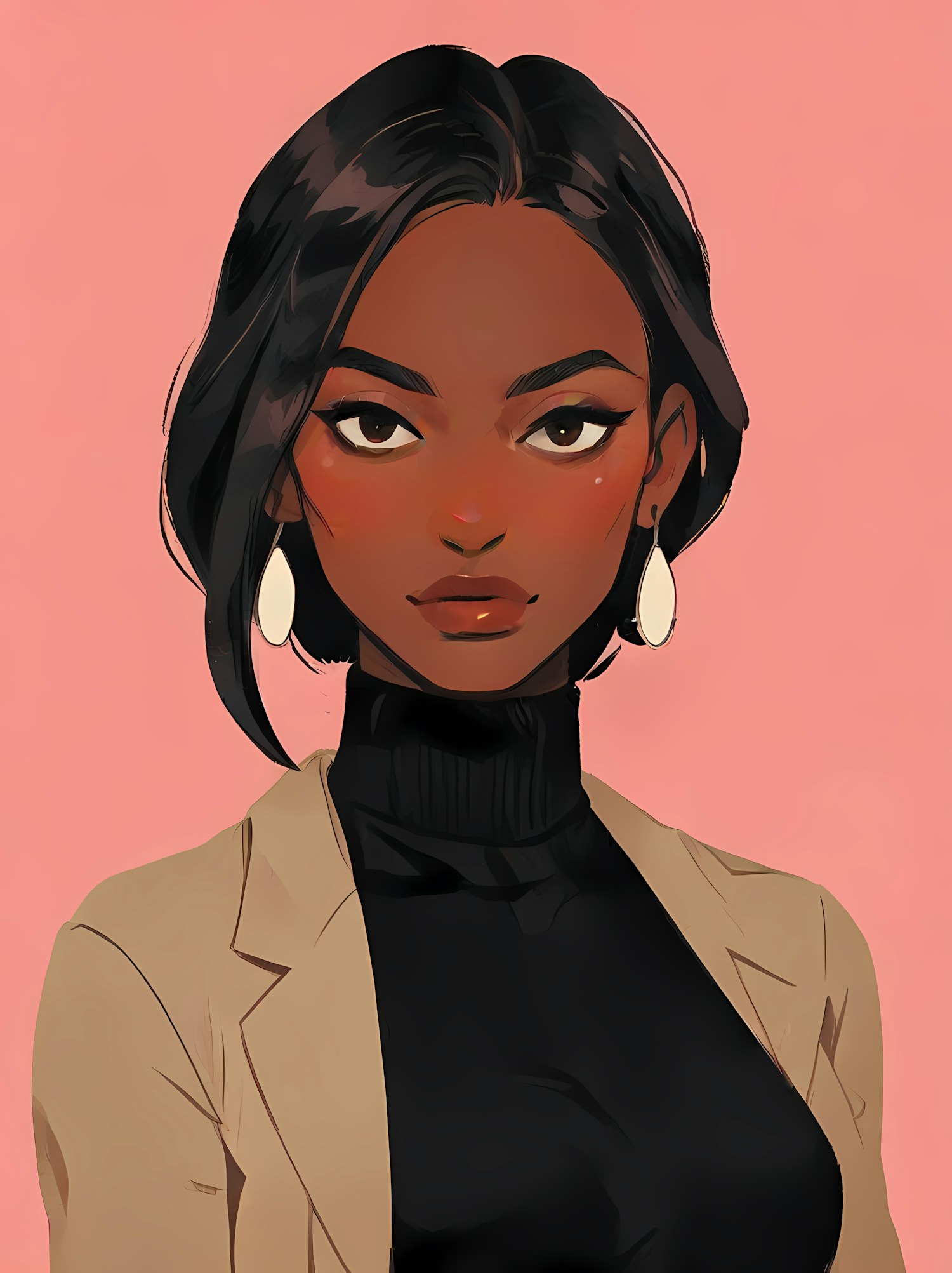 Elegant illustration of a woman with dark skin, black bob, and stylish attire against a soft pink background. Poised and confident.