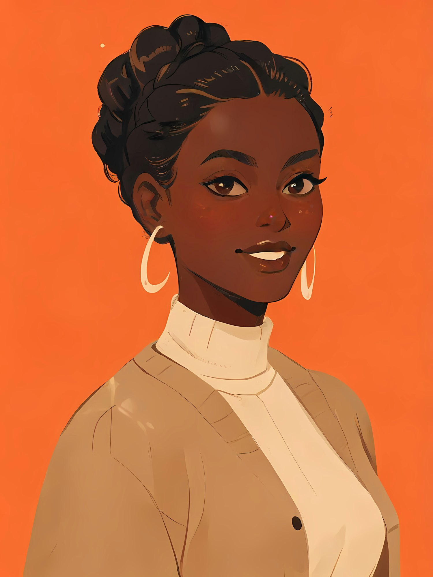 Stylish illustration of a Black woman with braided updo, hoop earrings, and a beige cardigan on an orange background.