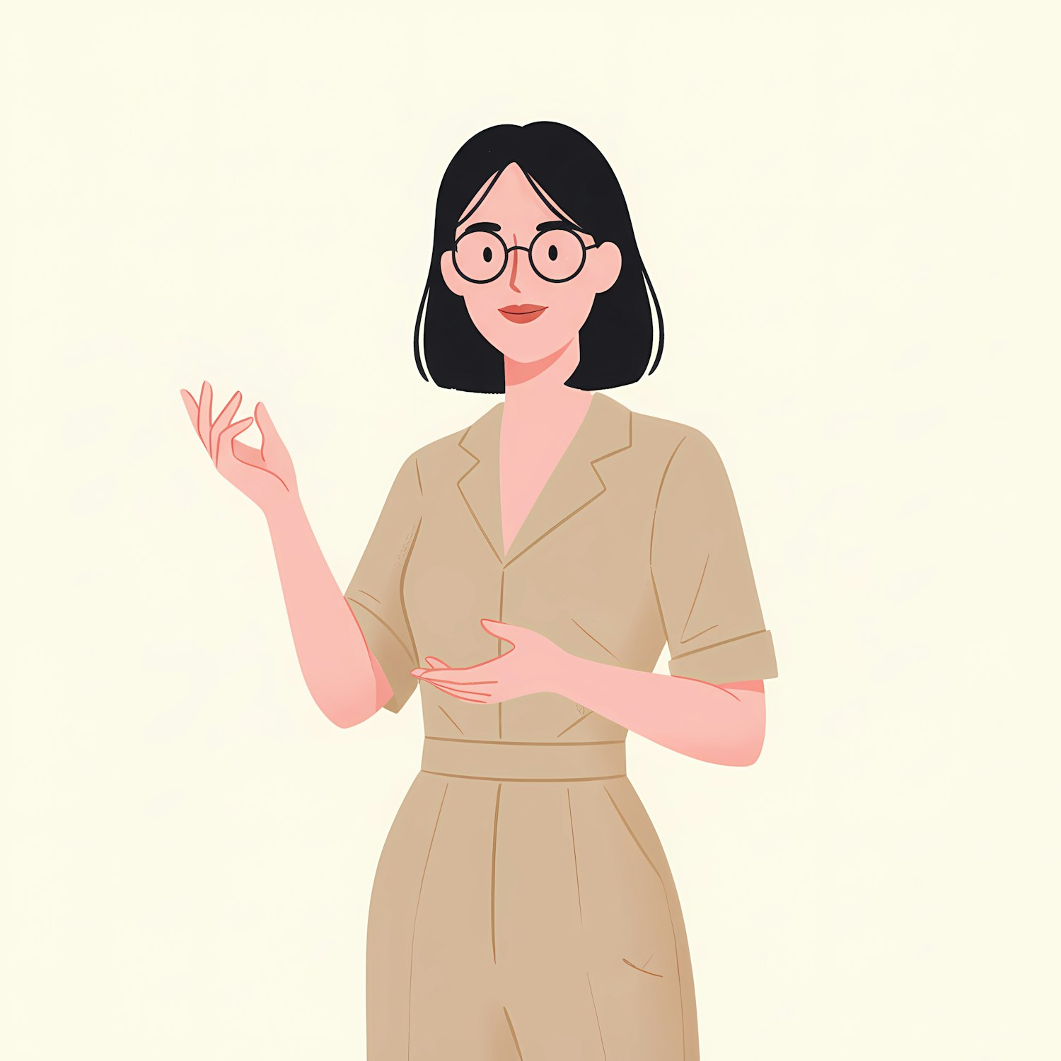 Illustration of a woman with glasses and short black hair, wearing a beige outfit, gesturing expressively against a light background.
