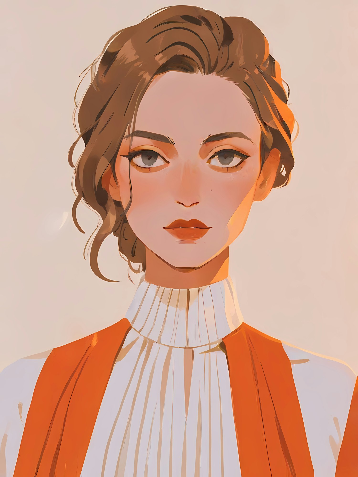 Stylized illustration of a woman with brown hair, wearing a white blouse and orange vest, set against a beige background.