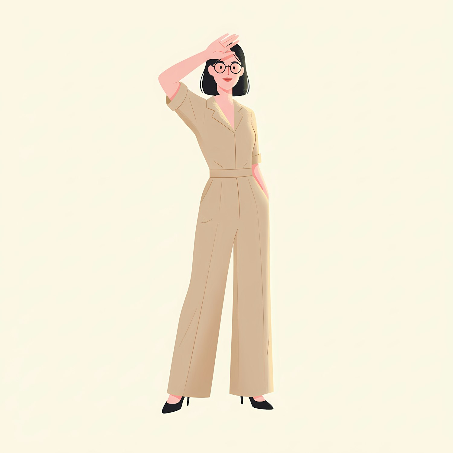 Stylized illustration of a woman in a beige jumpsuit and glasses, standing confidently with a hand shielding her eyes.