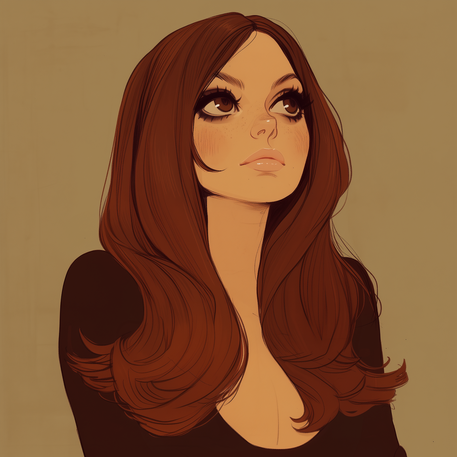 Stylized illustration of a woman with long brown hair, expressive eyes, and a contemplative expression against a warm, muted background.