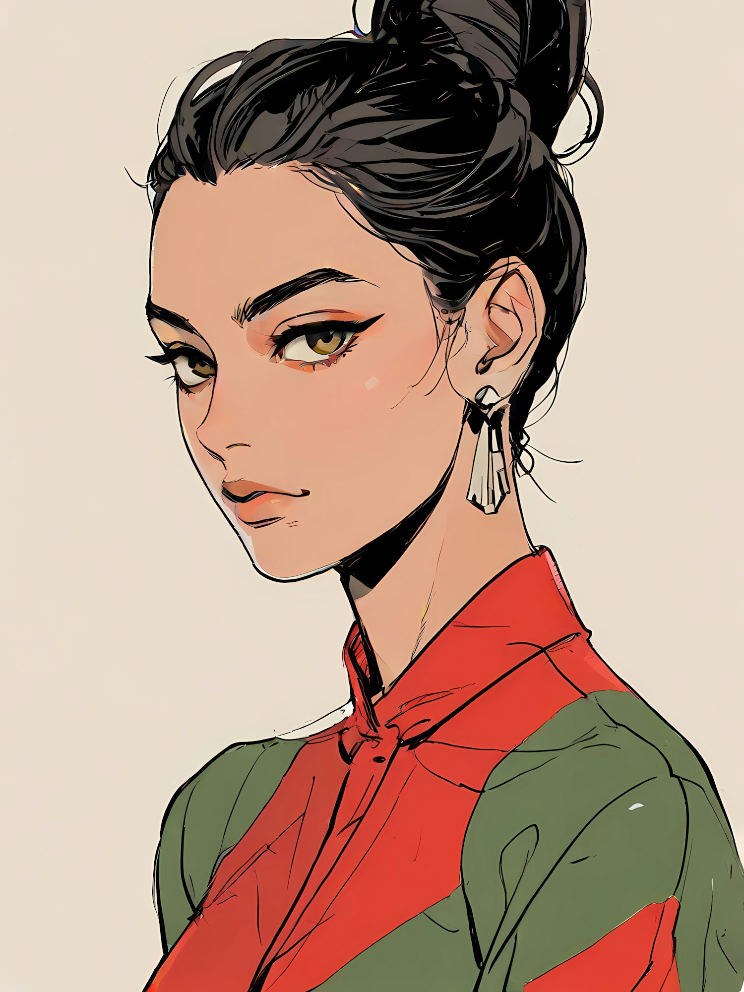 Stylized illustration of a woman with dark hair in a bun, wearing a red and green outfit and decorative earrings.