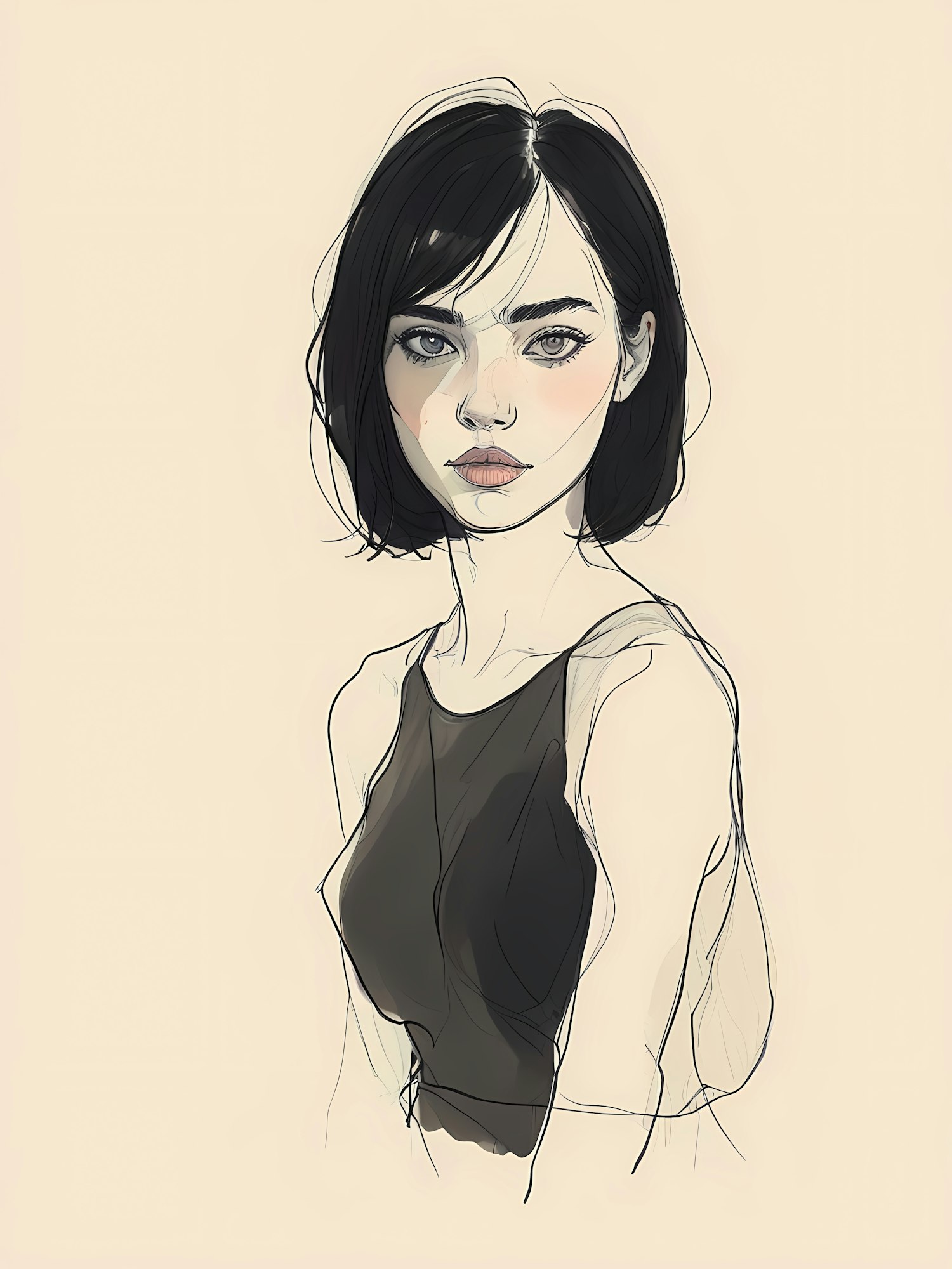 Elegant digital illustration of a young woman with short black hair and a sleeveless black top against a soft beige background.